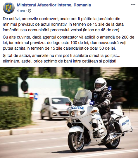 „De astăzi, amenzile contravenționale pot fi plătite la jumătate din minimul prevăzut de actul normativ, în termen de 15 zile de la data înmânării sau comunicării procesului-verbal (în loc de 48 de ore). Cu alte cuvinte, dacă agentul constatator vă aplică o amendă de 200 de lei, iar minimul prevăzut de lege este 100 de lei, dumneavoastră veți putea achita în termen de 15 zile calendaristice doar 50 de lei”, a anunțat MAI pe contul său de Facebook.