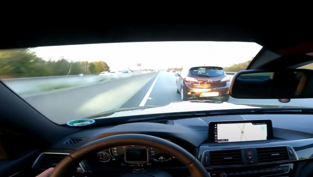 Filmat din interiorul unui BMW M4 ce rulează pe autostrada A5 spre Frankfurt, putem vedea cum șoferul evită coliziunea cu o Mazda3 frânând violent de la 280 km/oră la 130 km/oră. Sistemul de frânare al modelului BMW și-a făcut treaba excelent decelerând în aproximativ 3 secunde.
