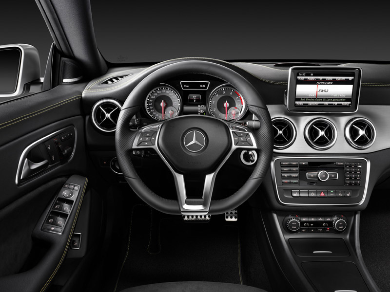 Tema sportivă a exteriorului noului CLA este continuată şi la interior. Acesta transmite o senzaţie puternică de calitate. Toate suprafeţele ornamentelor sunt galvanizate, rezultând un efect metalic.