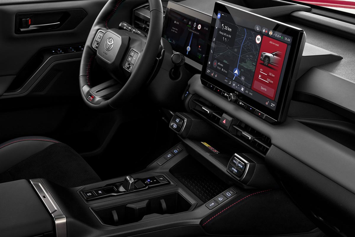 La interior sunt disponibile două ecrane. Instrumentarul virtual măsoară 12,3 inchi, iar displayul infotainmentului are diagonala de 12,9 inchi. Apropo de infotainment, Toyota inaugurează platforma Arene. Aceasta centralizează toate sistemele (multimedia, ADAS și recunoașterea vocală) pentru a scădea timpul de reacție și a eficientiza funcționarea.