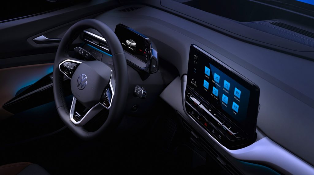 La interior se păstrează tema minimalistă lansată de ID.3, comenzile fiind grupate de display-ul tactil central. Volumul portbagajului variază între 543 și 1.575 litri.