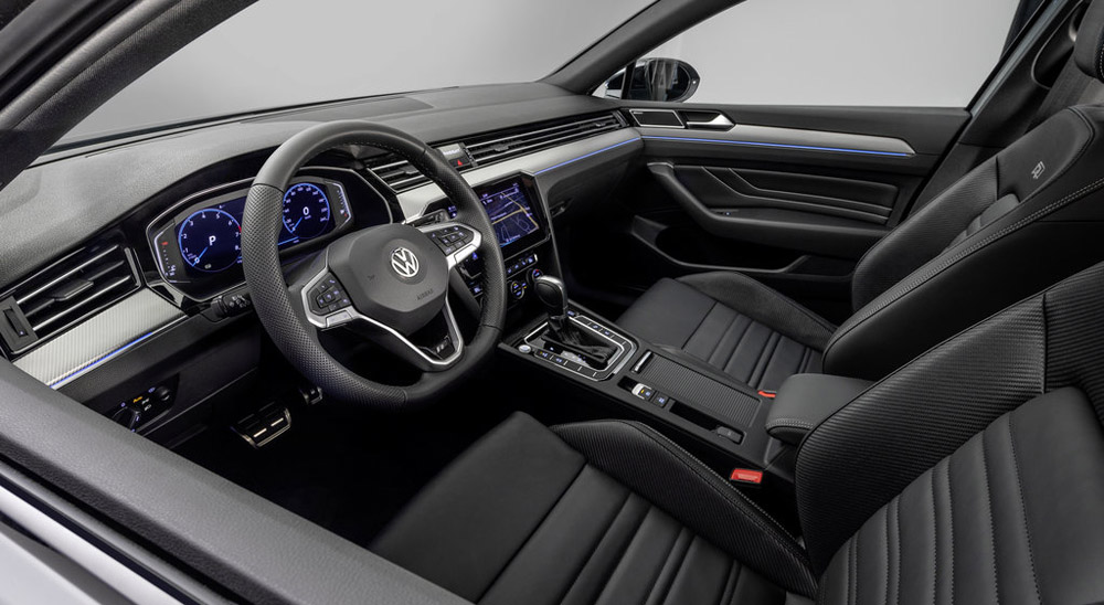 Negrul domină și interiorul. Șoferul și pasagerii au la dispoziție scaunele sport R-Line, cu panouri centrale acoperite cu piele Nappa. Pedalele sunt finisate din oțel inoxidabil și iluminarea ambientală nouă aduce o gamă largă de culori.