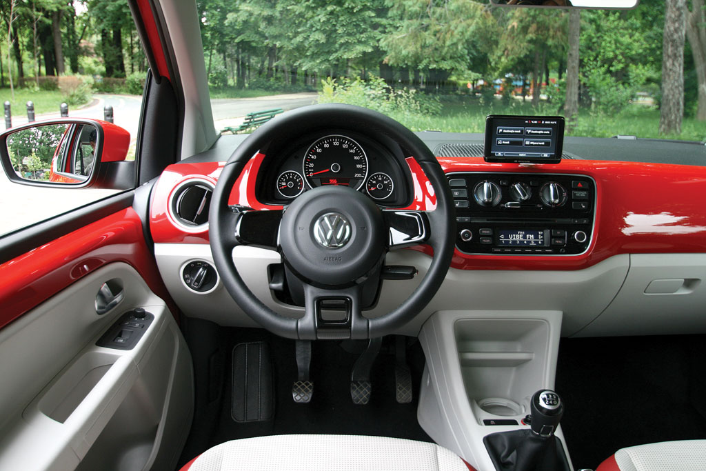 Dincolo de portierele poate prea generos dimensionate se află un interior surprinzător de relaxat pentru un automobil din grupul VAG. Când spun relaxat mă refer în special la cromatică, combinația de roșu, negru și gri deschis fiind una foarte reușită. Pe lângă senzația de spațiu pe care o generează aceste culori, remarcabil este și nivelul finisărilor. Cu toate că majoritatea suprafețelor sunt confecționate din plastic dur, ele au o textură plăcută, iar finisările sunt făcute la milimetru. Ca o paranteză, noul up! pare a fi mai bine finisat decât Beetle-ul pe care l-am condus acum câteva luni.