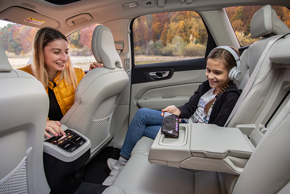 Fetele au „evadat“ în mașină. Pare-se că preferă calitatea suedeză, altminteri nu le-aș fi văzut cu degetele pe suprafețele fine și moi. Toate plasticele sunt plăcute la atingere, semn că nu s-a făcut nicio economie. Au la dispoziție patru mufe USB-C și încărcare wireless, iar sistemul premium Harman/Kardon, cu boxe inclusiv în plafon, le mângâie simțurile. Vine la pachet cu plafonul panoramic, cu climatizarea automată pe patru zone și cu sistemul de monitorizare a calității aerului, în pachetul Lounge, pentru 3450 de euro.