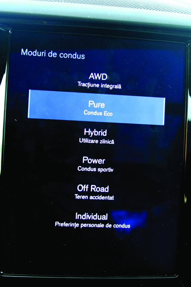 În modul Pure, se favorizează condusul 100% electric însă dacă se bruschează acceleraţia va porni şi motorul termic. Spre deosebire însă de Lexus, XC60 T8 merge în regim electric şi peste 60 km/h şi acceleraţia se poate călca mai tare decât la Lexus fără a porni motorul termic.