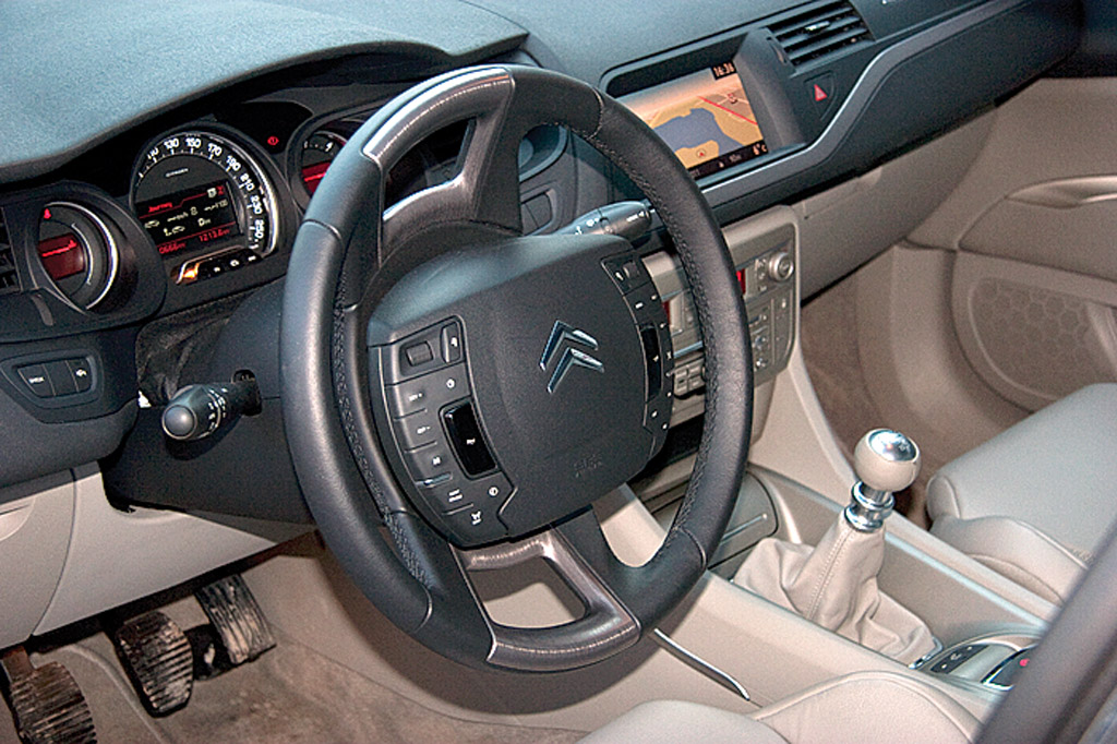 Primul impact îl vei avea când vei vira și vei avea senzația că asamblarea volanului a cedat. Inovația propusă de Citroen, cu centrul volanului fix, necesită un timp de acomodare și poate fi, după concepțiile fiecărui utilizator în parte, fie genială, fie o găselniță mai puțin reușită. Finisajele și materialele bune n-au beneficiat din păcate și de o asamblare la același nivel, rigurozitatea germană la care s-a sperat, lipsind pe alocuri. Avantaj Avensis și dublu avantaj Passat.